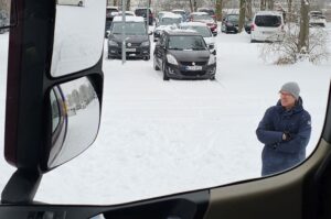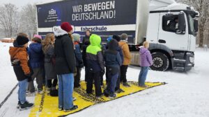 Schubweise wurden die Schüler aus neun Klassen des 5. Jahrgangs auf den Parkplatz geführt, wo drei schwere Lastwagen der hannoverschen Fahrschule Steckelberg – die eine Zweigstelle in Hemmingen hat – einen Vormittag lang auf sie warteten. Fünf Fahrlehrer und sieben Fahrschüler ließen die Fünftklässler den Sitzplatz hinter dem Steuer eines 18- oder 26-Tonners erklimmen und zeigten jedem einzelnen Kind, dass es sowohl unmittelbar vor dem Führerhaus eines Lkw wie rechts davon große Bereiche gibt, die ein Fahrer schlecht oder gar nicht einsehen kann. Auf dem schneebedeckten Boden ausgelegte dreieckige Planen kennzeichneten den sogenannten toten Winkel, der am äußeren Rand bis zu sechs Meter von der rechten Beifahrertür entfernt sein kann.
