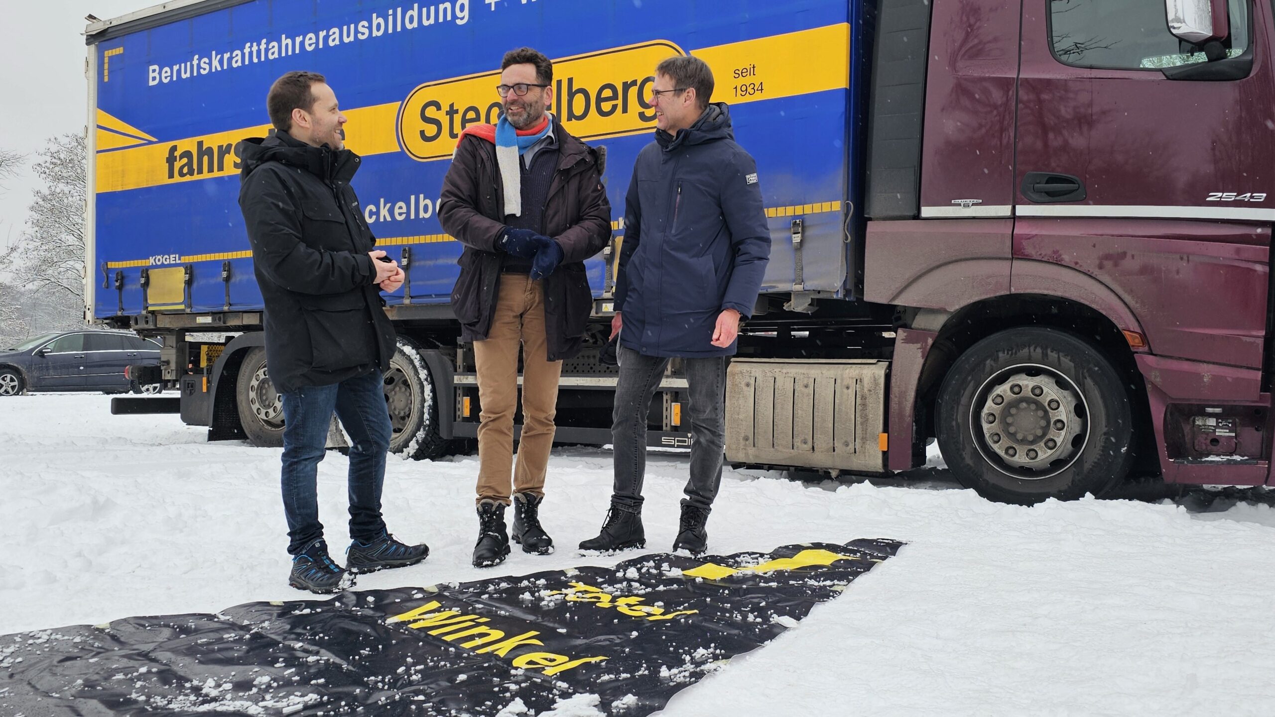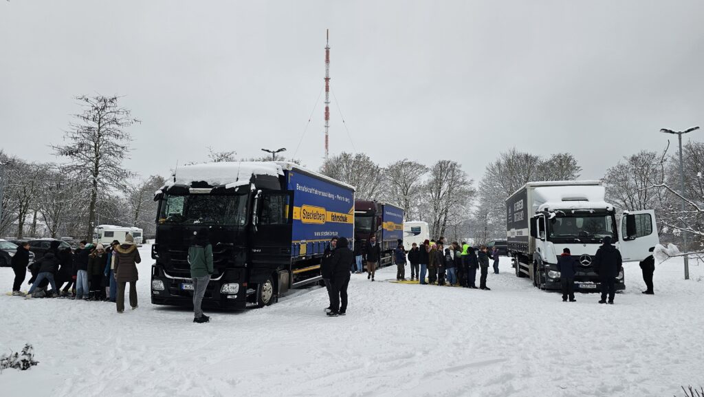 Schubweise wurden die Schüler aus neun Klassen des 5. Jahrgangs auf den Parkplatz geführt, wo drei schwere Lastwagen der hannoverschen Fahrschule Steckelberg – die eine Zweigstelle in Hemmingen hat – einen Vormittag lang auf sie warteten. Fünf Fahrlehrer und sieben Fahrschüler ließen die Fünftklässler den Sitzplatz hinter dem Steuer eines 18- oder 26-Tonners erklimmen und zeigten jedem einzelnen Kind, dass es sowohl unmittelbar vor dem Führerhaus eines Lkw wie rechts davon große Bereiche gibt, die ein Fahrer schlecht oder gar nicht einsehen kann. Auf dem schneebedeckten Boden ausgelegte dreieckige Planen kennzeichneten den sogenannten toten Winkel, der am äußeren Rand bis zu sechs Meter von der rechten Beifahrertür entfernt sein kann.